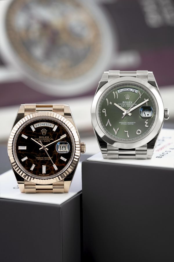 Left: A 2021 Rolex Day-Date 40mm ref. 228235 in 18k Everose gold with ‘Eisenkiesel’ dial that’s available for immediate purchase from Phillips PERPETUAL. Price: £49,500 Right: A 2022 Rolex Day-Date 40mm ref. 228206 in platinum with olive-green ‘Eastern Arabic’ dial that’s available for immediate purchase from Phillips Perpetual. Price: £75,000