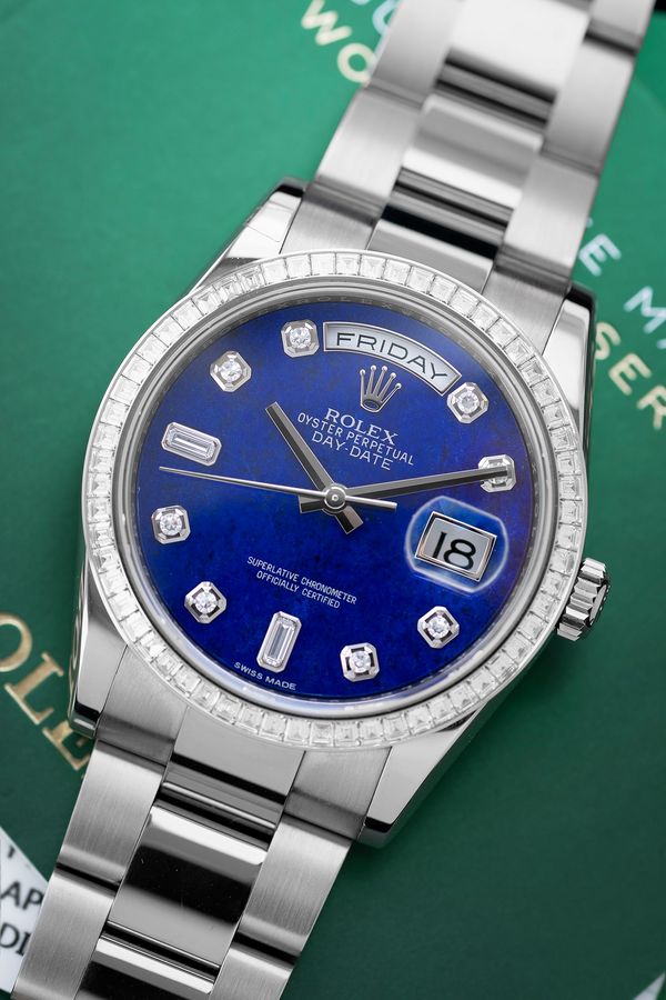 A 2019 Rolex Day-Date 36mm ref. 118399 in 18k white gold with lapis lazuli dial that's available for immediate purchase from Phillips PERPETUAL. Price: £57,500