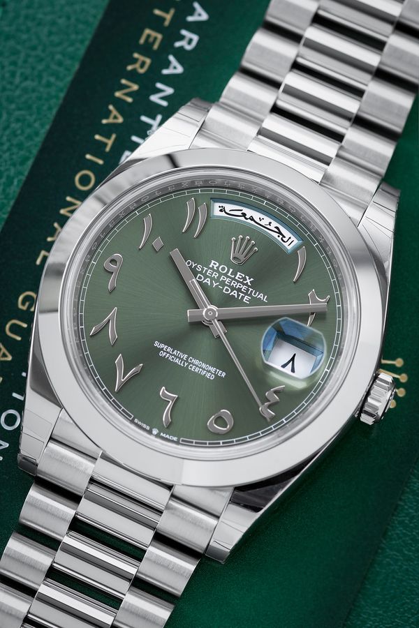 This is modern Rolex Day-Date collecting at its most exciting. The 40mm platinum case carries weight, both literally and symbolically, while the ice-like sheen of platinum pairs seamlessly with the olive-green sunburst dial. What sets this watch apart are the Eastern Arabic numerals, which add depth, cultural significance, and rarity, as Rolex only produces these dials in very limited quantities for select markets.