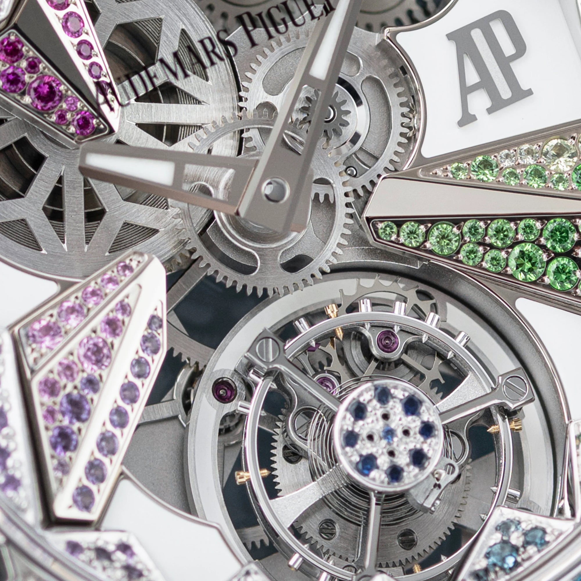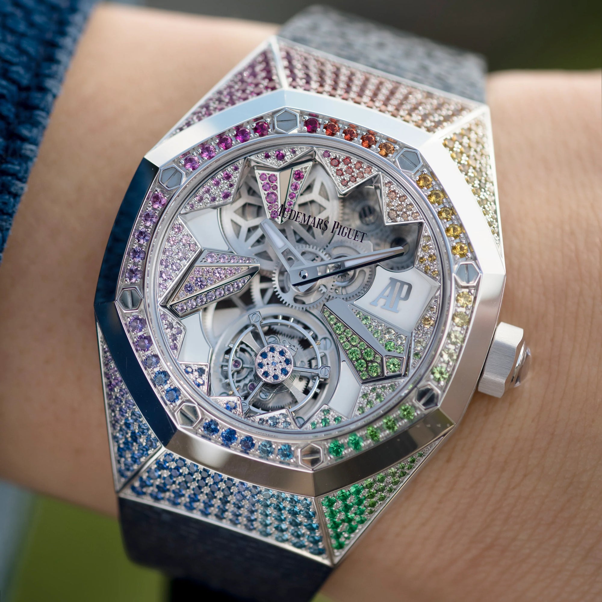 A total of 468 brilliant-cut, multi-colored gemstones of 12 different types are set on almost every visible surface of the 18k white gold 38.5mm × 11.4mm watch, both on the exterior case and the exposed sections of the dial inside the sapphire crystal – a small number of stones have even been set on the flying tourbillon cage!