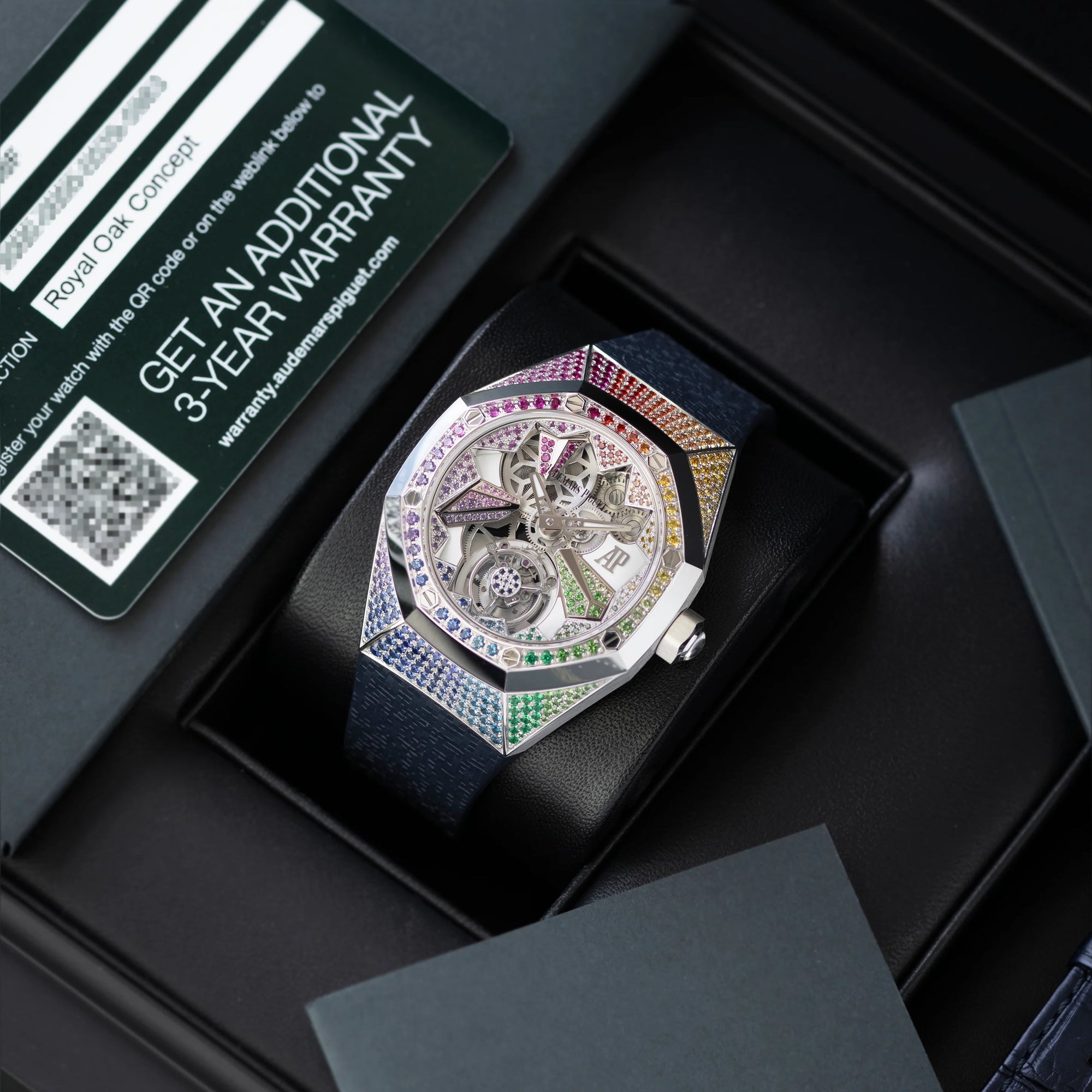 The watch we're highlighting today, however, is not currently accessible on Audemars Piguet's digital catalogue. It's the Royal Oak Concept Flying Tourbillon, featuring a gorgeous "rainbow" setting (Ref. 26227BC.YY.D326CR.01-A).