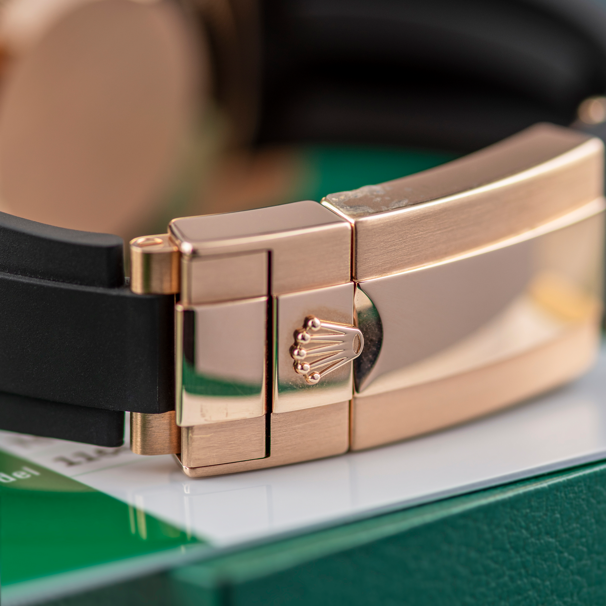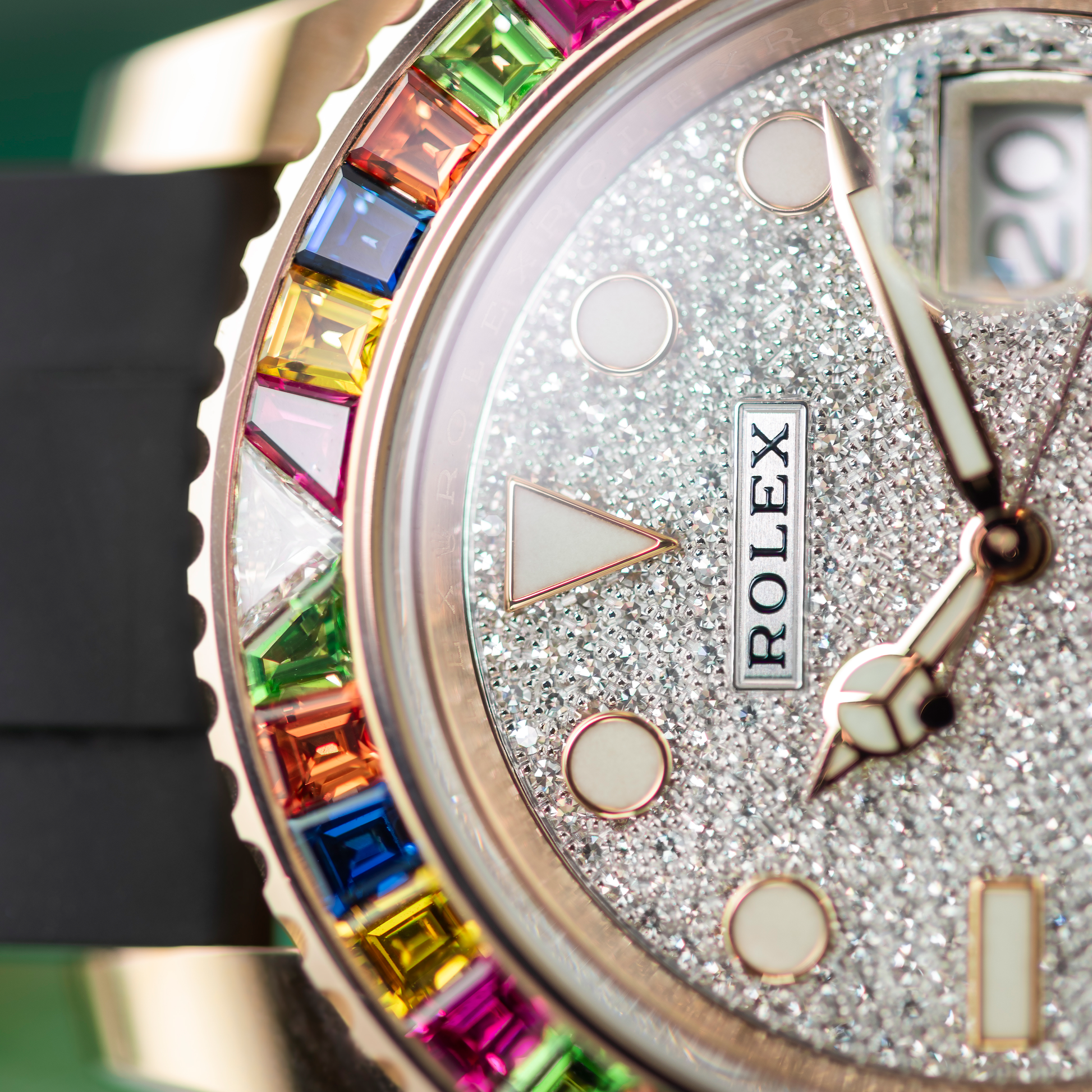 Launched in 2017, the 116695SATS Yachtmaster was unlike anything Rolex had every produced before. Its candy-coloured gem set bezel immediately earned it the sweetest of nicknames, and complemented the 18ct Everose gold case beautifully. Set with 38 coloured sapphires and a single large diamond at 12, and available in both plain and pavé versions, it was this premium execution with the full diamond dial that really set the world alight and set the stage for the re-introduction of the Rainbow Daytona a year later. Found in excellent condition and complete with its full complement of original Rolex box, warranty card booklets and tag.