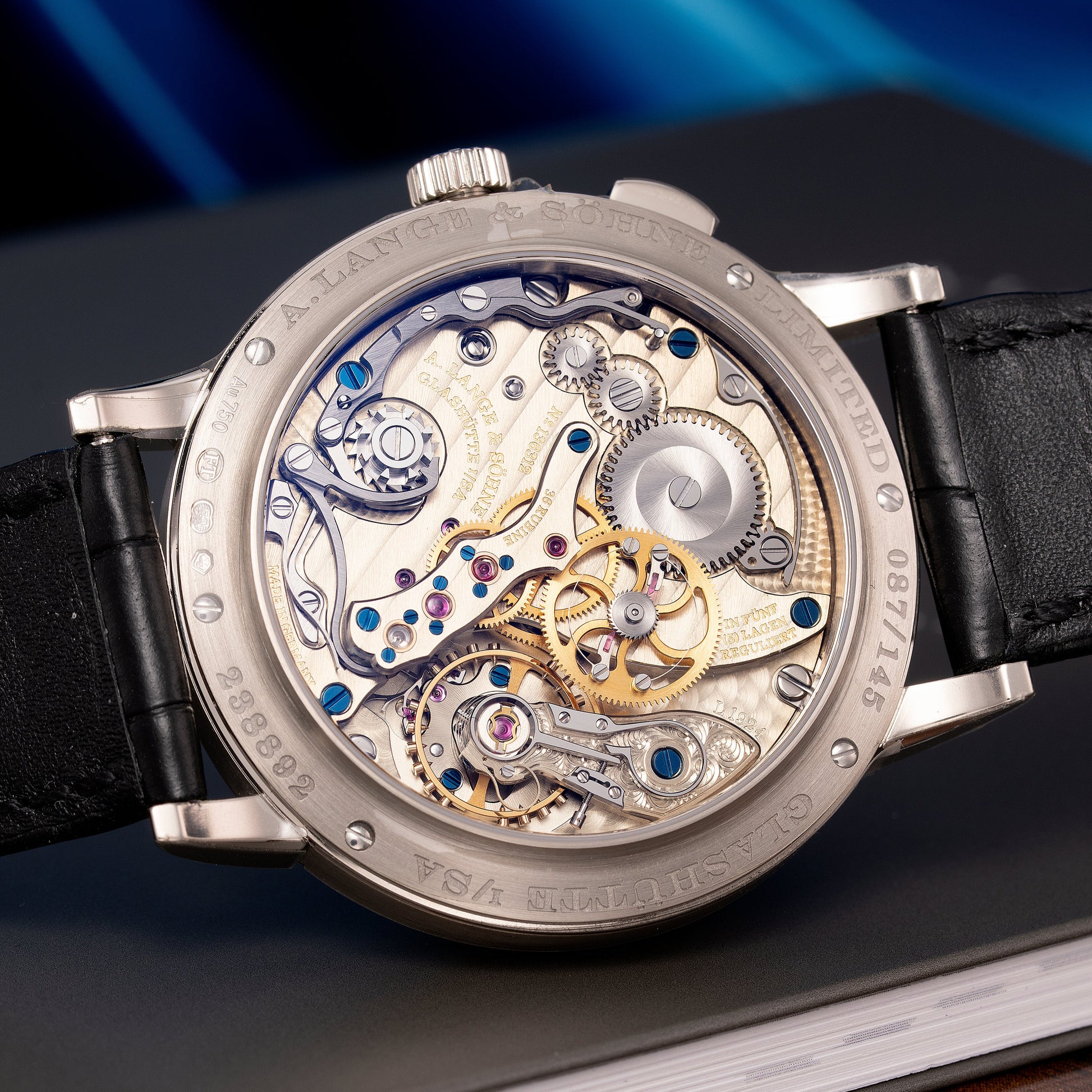 Unveiled at SIHH in January 2018 and produced in limited runs of 145 pieces in white gold, this example is a New-Old-Stock accompanied by Lange Guarantee Seal dated Oct 2021, presentation box, and outer packaging.
