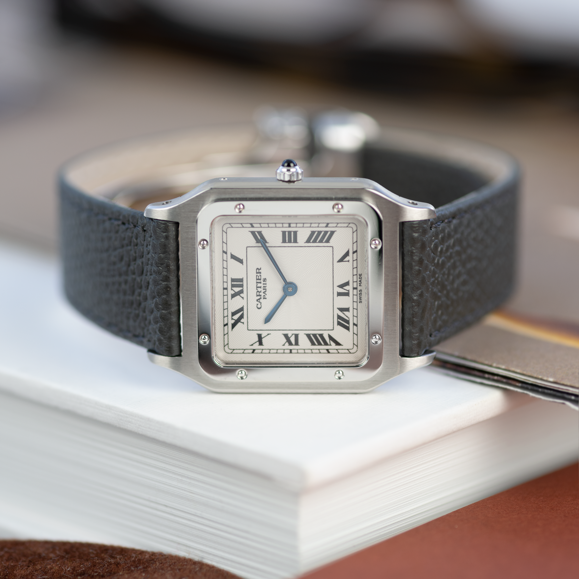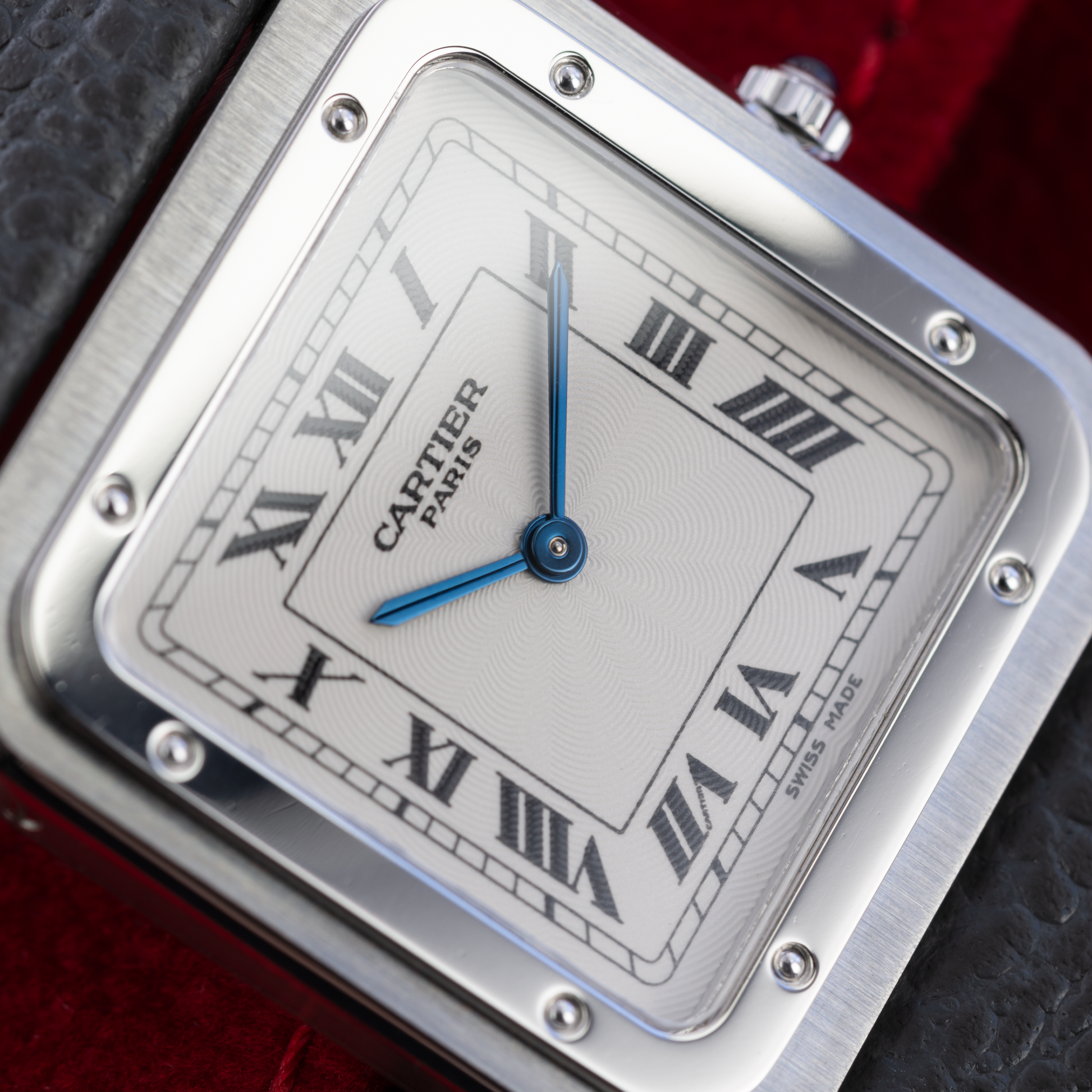 The platinum Santos 1575 is one of Cartier's most elegant and sought after contemporary references. Doing exactly what the Maison does best, slim, classically inspired and extremely wearable. Ticking all the iconic Cartier boxes, blued sword hands, guilloche dial, chemin de fer, and blue cabochon crown, this example comes to us in wonderful condition, retaining the crips edges to the bezel that the watch is famous for.