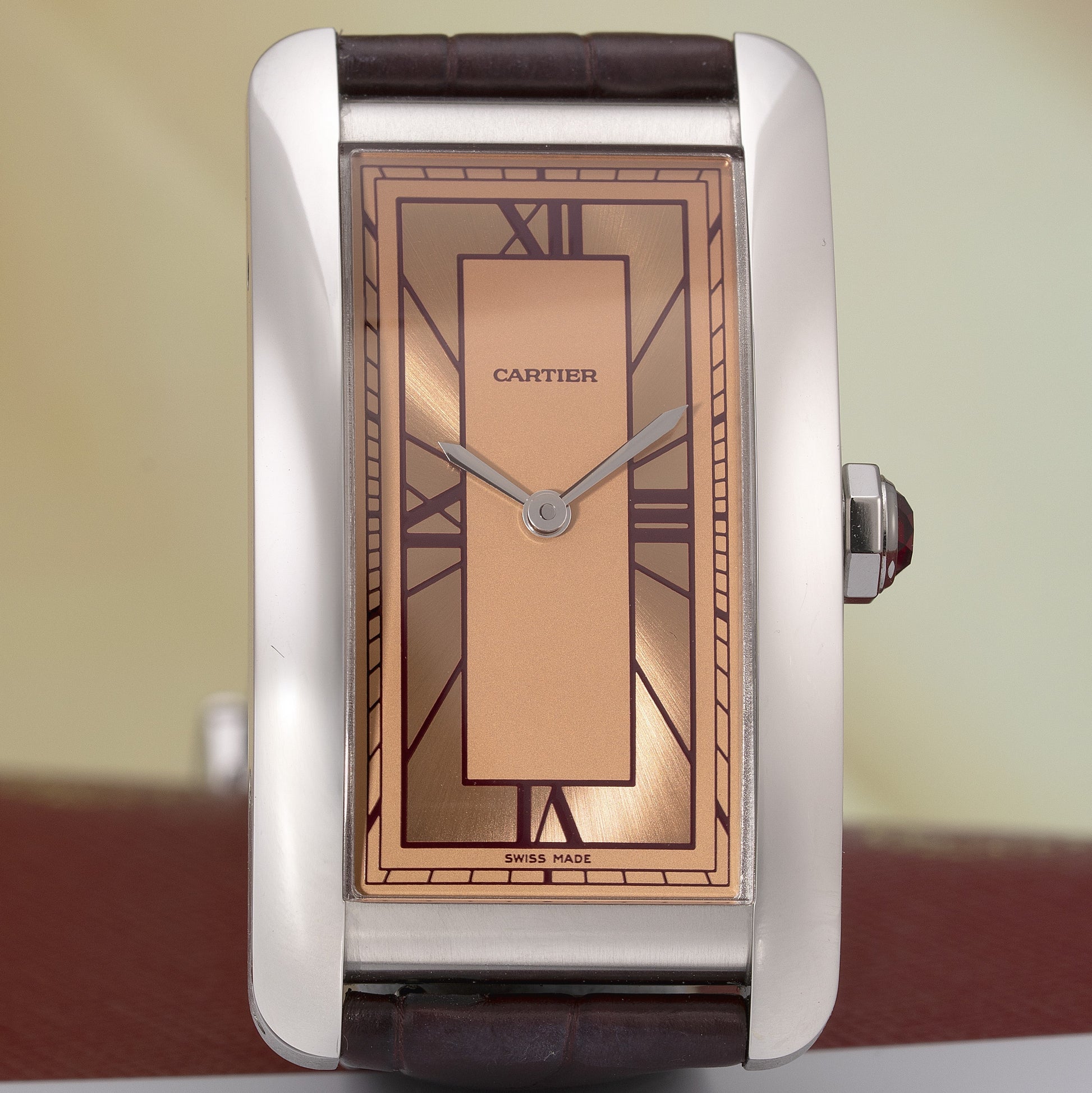 In 2024, Cartier refreshed the Tank Américaine line with a platinum large model featuring a salmon Art Deco dial. It has a simplified display with only hour and minute hands, revised proportions, and measures 44.4 × 24.4 × 8.7 mm.